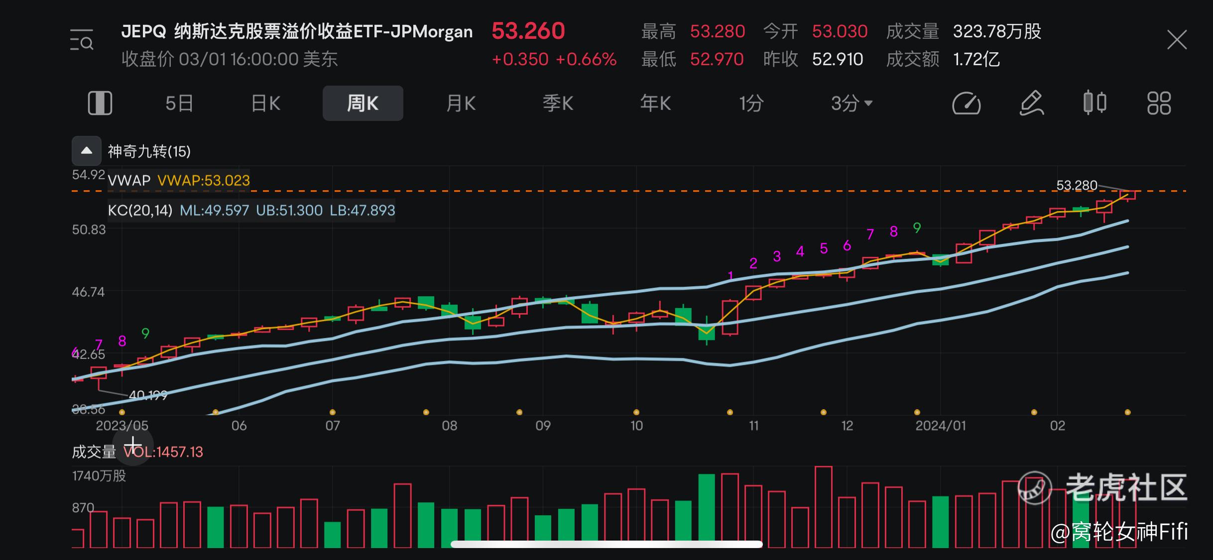 我们从周K线上看到JEPQ从去年5月起开始,价格一路推高。