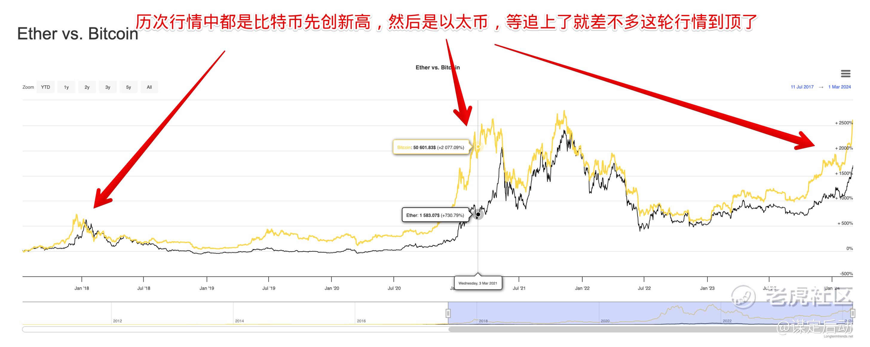 历次行情中都是比特币先创新高,然后以太币接棒
