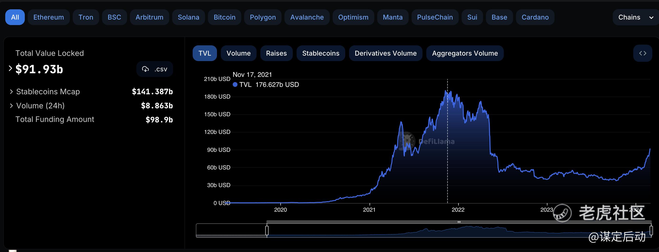 衡量DeFi规模的数字是Total Value Locked (TVL),下图看出仅有900亿美元,这只相当于一个美国小型银行的规模。