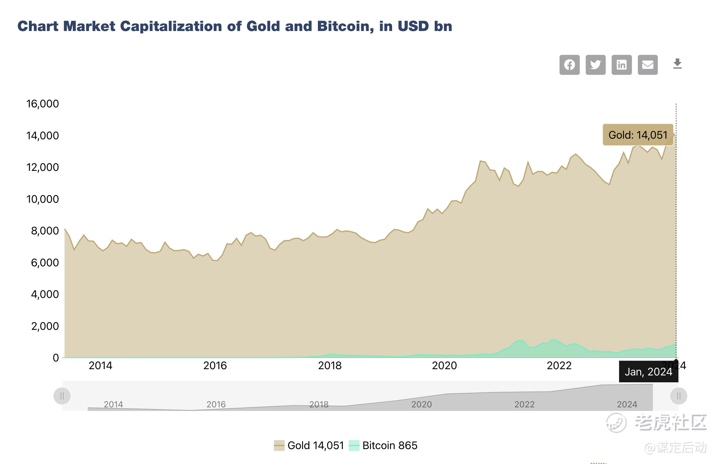 截止2024年1月,黄金市场总市值大概14万亿美元,而比特币是0.8万亿美元。这个差距大概是17倍,也就是说,即使比特币能达到黄金市场总市值的一半,也会有近10倍的增长空间。