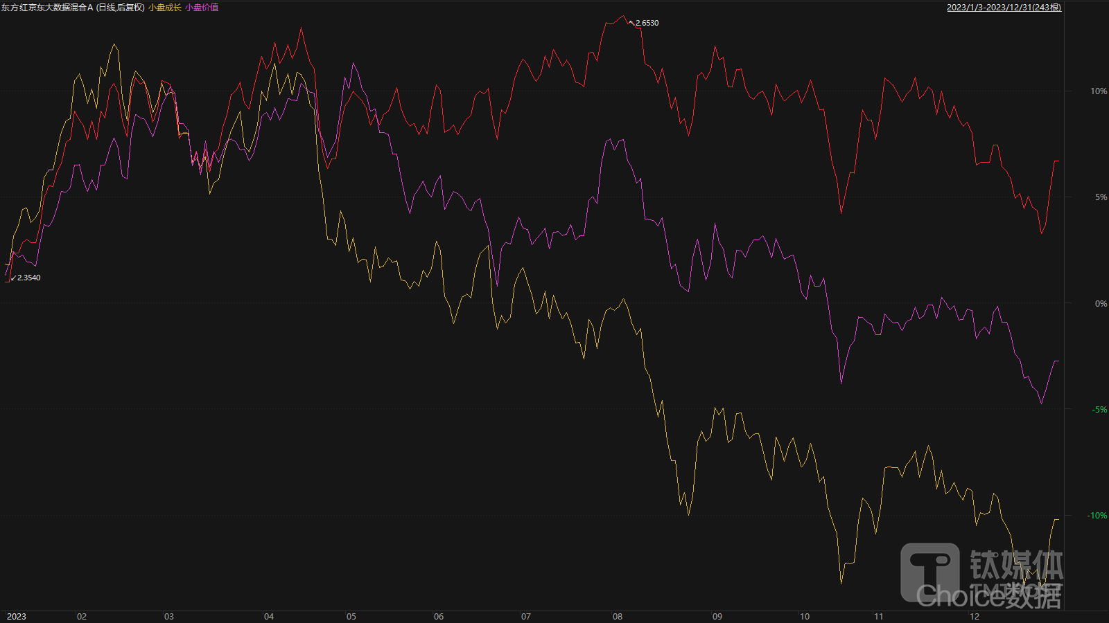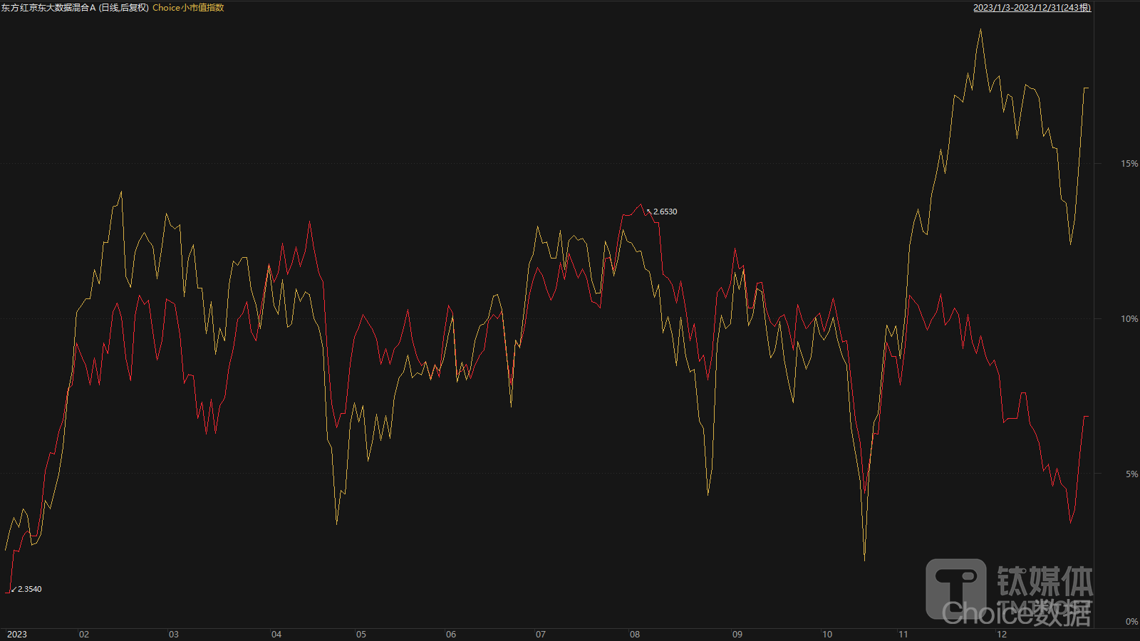 (2023年前10个月,东方红京东大数据混合A的净值走势与Choice小市值指数高度趋同,数据来源:Choice终端)