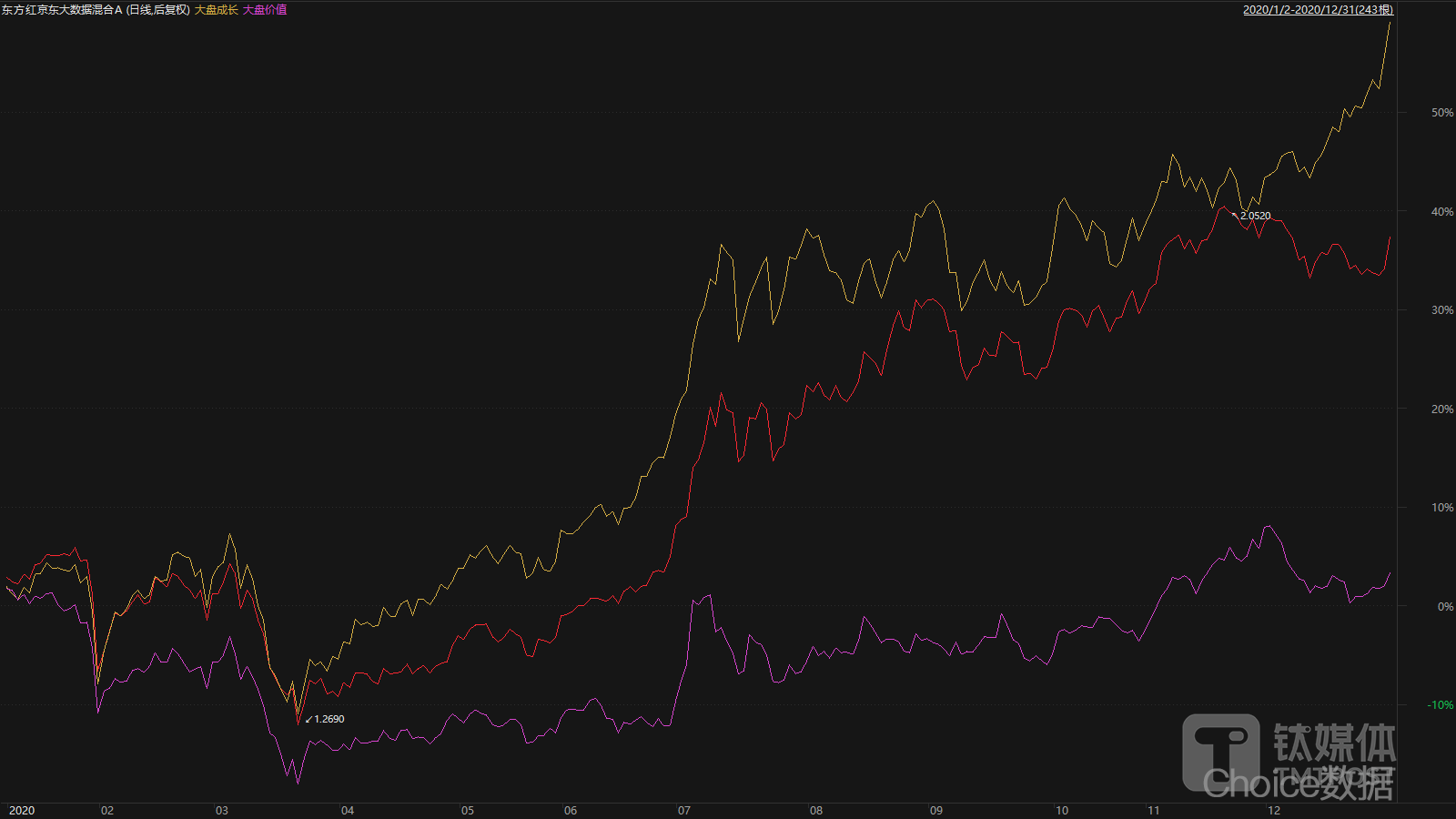 (2020年时东方红京东大数据混合A的走势与大盘成长高度相似,数据来源:Choice终端)