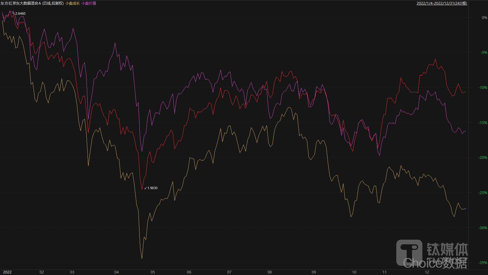 (2022年前十个月,东方红京东大数据混合A的净值走势介于小盘成长与小盘价值之间,数据来源:Choice终端)