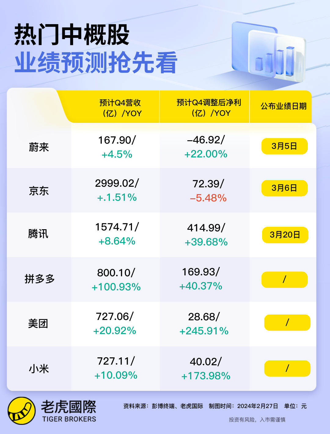 $京东(JD)$ 将于美国东部时间3月6日(周三)美股盘前发布截至2023年12月31日的第四季度及全年财报,据彭博一致预期,京东集团Q4营收为2999亿人民币,同比上涨1.5%;调整后净利润为72.39亿人民币,同比下滑5.48%。