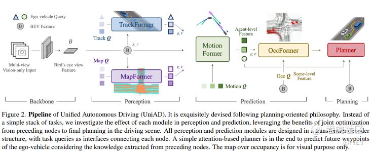 例如2023年CVPR best paper提出的UniAD就是一种分模块端到端训练方式,这种方式通过端到端训练避免了多任务训练的融合难题实现全局最优,又保留了分模块系统的优势、可以抛出中间模块的结果进行白盒化分析,反而更具灵活性对部署也更友好,如图所示: