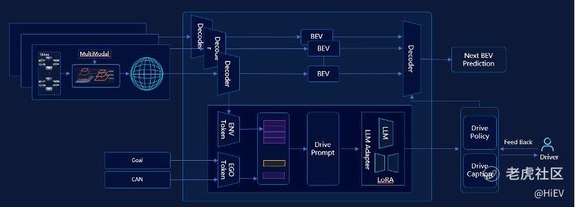 于是,毫末在端到端自动驾驶中又引入了大语言模型,通过感知大模型识别万物后,将这些信息输入LLM,通过LLM来提取世界知识,并作为辅助特征来指导驾驶决策。如图所示,这个系统极为复杂,算力消耗非常大,目前还只能在云端运行,未来几年将加快向车端的落地。