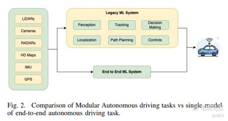 与传统的自动驾驶方式对比可见,同样的输入、同样的输出,传统自动驾驶包含多个任务(多个模块),但是端到端只有一个任务。此处容易产生一个误区,即认为传统的自动驾驶是多模块的、端到端自动驾驶是单模块的,把分模块与分任务的概念搞混了。