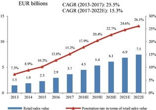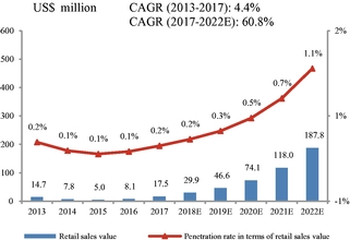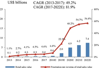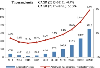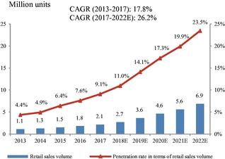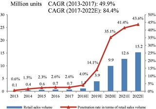 截至2017年12月31日,中国绝大多数电动两轮车都使用铅酸电池。CIC估计,到2022年,锂离子电池驱动的电动两轮车的渗透率(按零售额计算)预计将达到约56.8%。锂离子电池的零售量中国电动两轮车市场从2013年的10万辆迅速增长至2017年的70万辆,在锂离子电池采购成本下降的情况下,复合年增长率为49.9%。到2022年,锂离子电池动力两轮车市场的零售量预计将达到1520万辆,2017年至2022年的复合年增长率为84.4%,