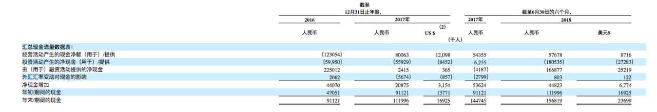 下表列出截至2016年及2017年12月31日止年度及截至2017年及2018年6月30日止六个月的综合现金流量数据: