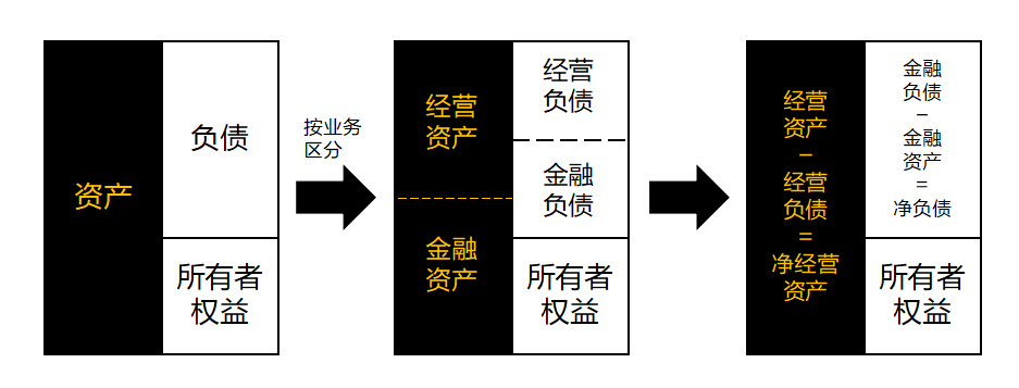 财务管理上会对资产负债表做一个调整,也就是我们常说的“管理用财务报表”,其调整如下图所示: