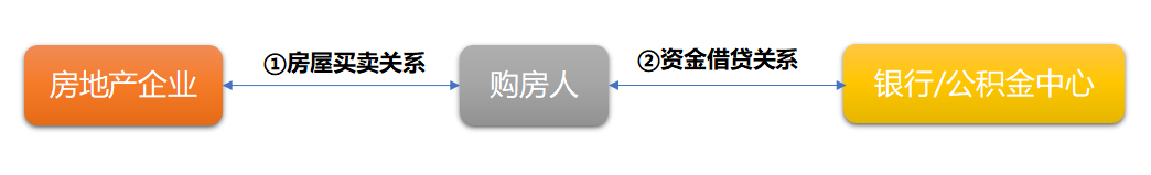 从上面购房尾款的形成过程来看,房企、购房人、银行/公积金中心三方共形成了两种法律关系,即房企和购房人之间的房屋买卖关系,以及购房人和银行/公积金中心之间的资金借贷关系,如下图所示: