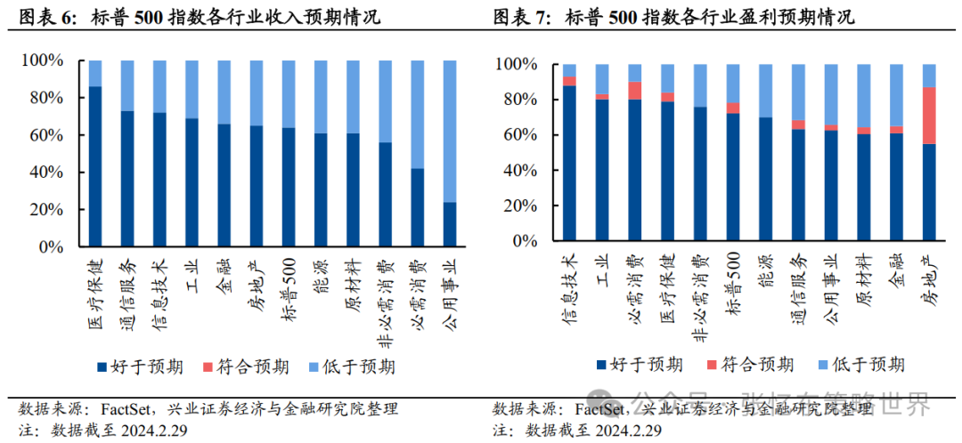 截至2月29日,已发布财报的标普500成分股公司中,73%的公司盈利好于预期,其中信息技术(88%)、工业(81%)、必需消费(81%)、医疗保健(79%)、非必需消费(76%)好于预期的比例较高;而在收入预期中,64%的标普500成分股收入好于预期,医疗保健(86%)、通讯服务(73%)、信息技术(72%)、工业(69%)好于预期的比例较高(括号内为2023Q4,各行业公司收入或盈利好于预期的比例)。