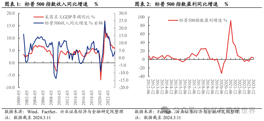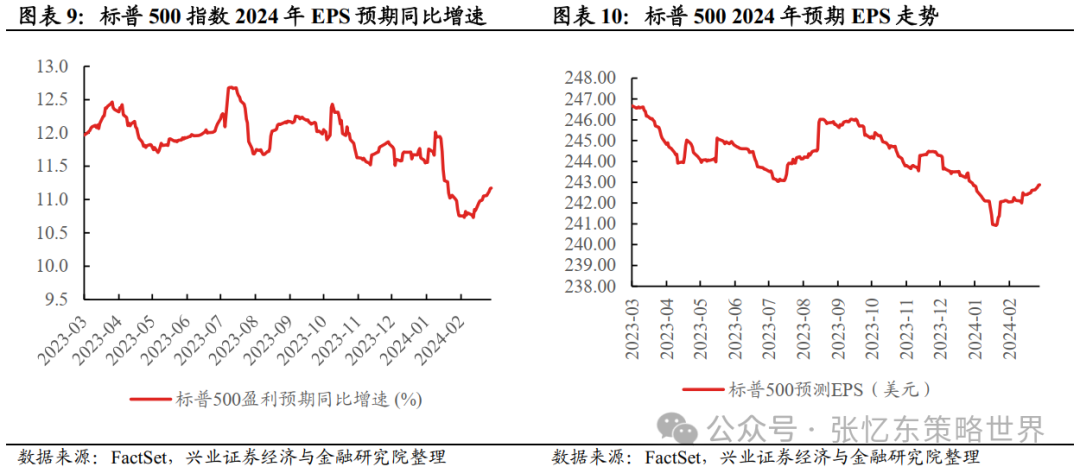 2024年标普500盈利预期进一步上调,标普500 2024年预测EPS自1月底以来不断回升,盈利预期同比增速由低点时的10.7%回升至3月8日的11.2%。