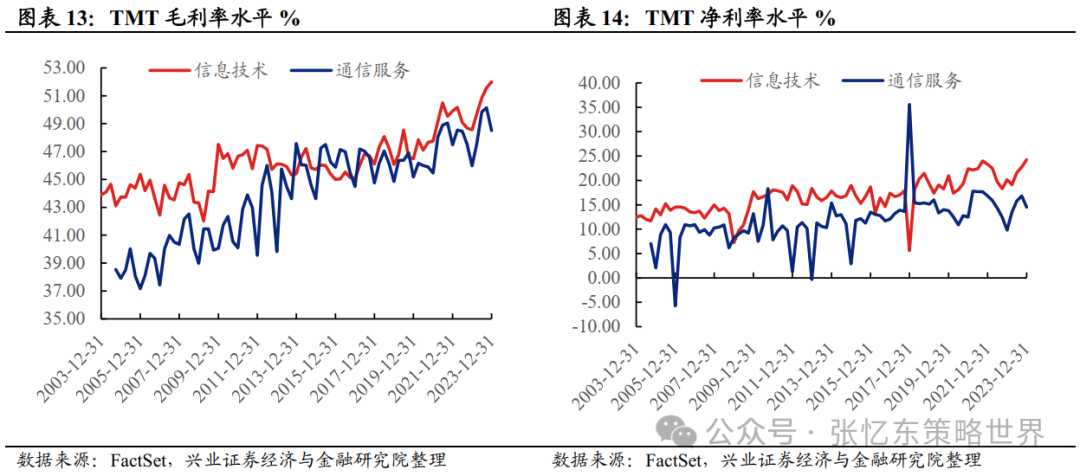 信息技术毛利率、净利率达到52.0%、24.2%,是2011年以来的季度最高值;通信服务分别为48.5%、14.5%,同样处于2011年以来的历史高位。