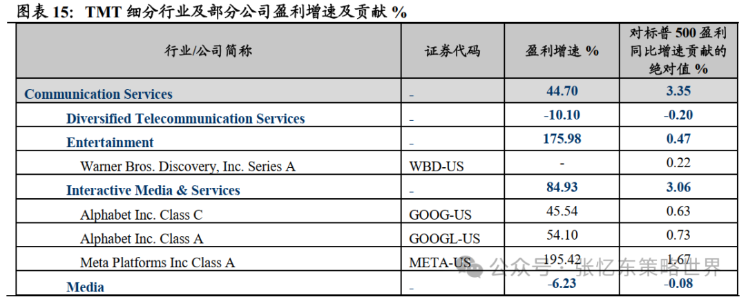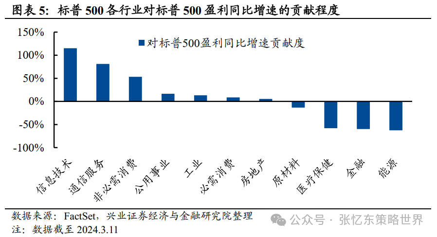 从对标普500盈利同比增速贡献的角度来看,信息技术、通信服务、非必需消费贡献明显。