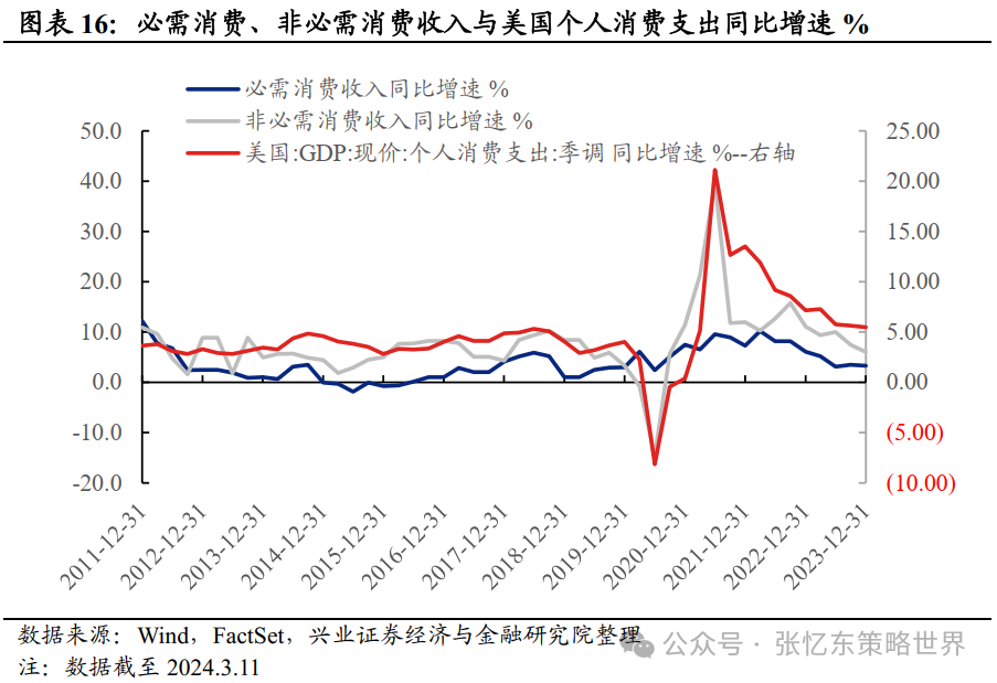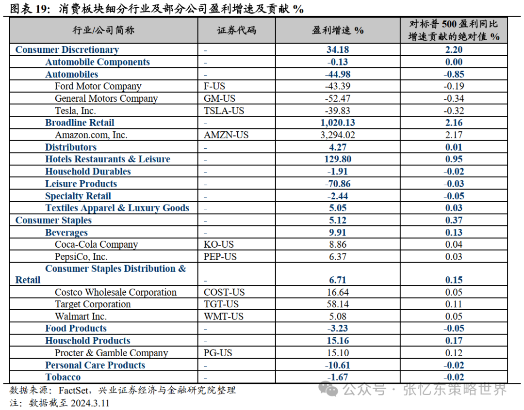 美国2023年四季度消费稳健,支撑必需与非必需消费收入增长。截至3月11日,2023Q4必需消费、非必需消费收入同比增速分别为3.32%、6.05%,盈利同比增速为5.1%、34.2%。必需消费细分行业中,以宝洁为代表的家居用品、以塔吉特为代表的必需消费品分销和零售,以及饮料是主要贡献;非必需消费中权重股亚马逊是主要贡献,持续的成本削减措施帮助四季度业绩和一季度指引好于预期,其中云业务营收同比增长13%。