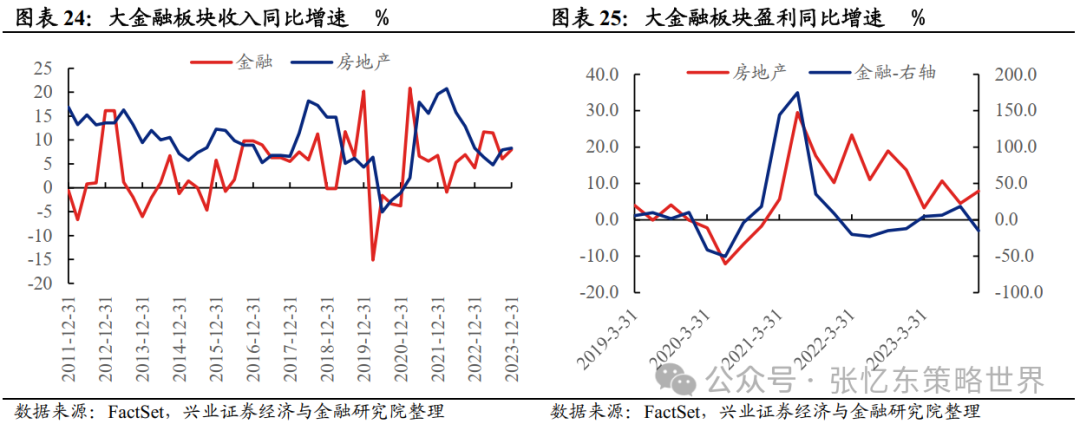 2023Q4房地产收入和盈利同比增速相对平稳,分别为8.3%、7.9%,较2023Q3有所回升。金融行业收入为8.0%,但盈利同比增速由2023Q3的18.4%下滑至2023Q4的-14.9%。