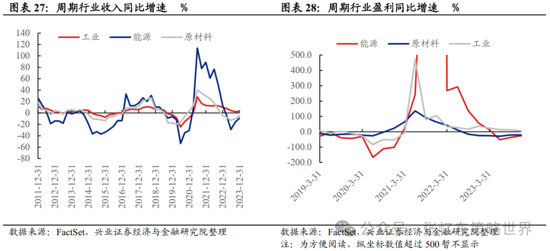 2023Q4工业、能源、原材料收入同比增速较三季度均有所回升,分别为2.9%、 -9.3%、-5.1%;能源盈利同比增速由Q3的-36.9%升至-25.3%,工业、原材料盈利同比增速较Q3继续下滑,分别为6.3%、-20.4%。