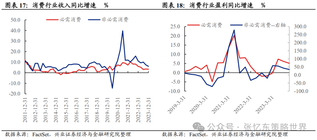 必需消费(+5.1%)、非必需消费(+34.2%)、房地产(+7.9%)行业2023Q4盈利同比增速相对稳定。