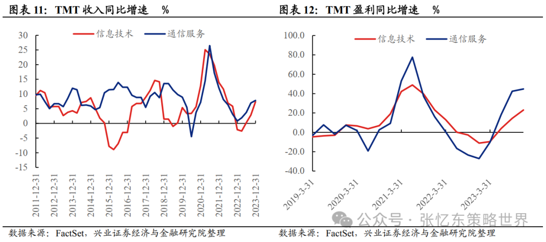 四季度,信息技术、通信服务收入和盈利同比增速继续回升,收入同比增速分别为7.37%、7.83%,盈利同比增速分别为23.0%、44.7%。