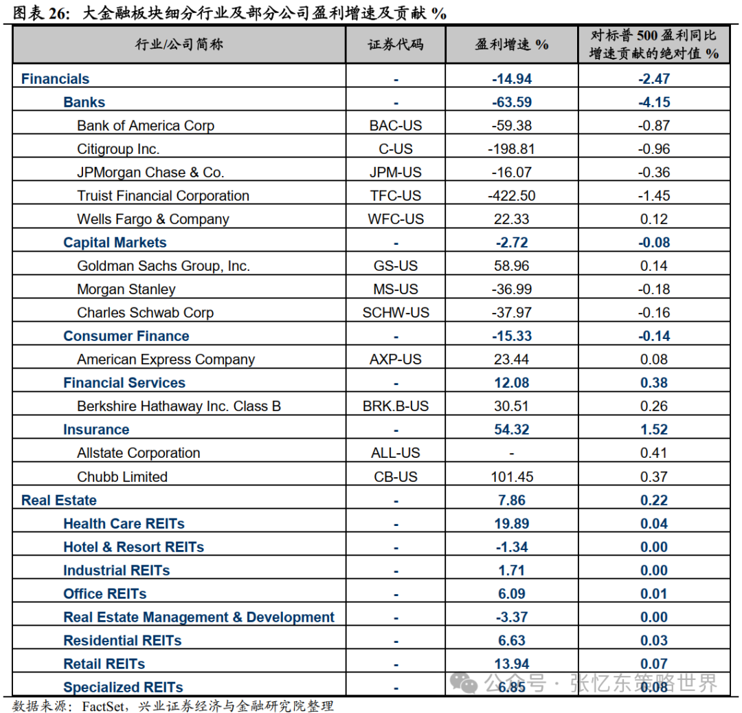 六、大金融:地产业绩平稳,金融盈利同比增速大幅下滑。银行增速大幅回落至-63.6%,其中美银、花旗和TFC拖累较为明显。保险板块盈利同比增速高达54.3%,是金融细分行业中增速最高的板块。