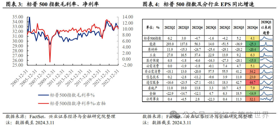 截至3月11日,2023Q4标普500收入同比增速为4.14%,增速连续两个季度回升,处于2011年以来的中枢水平;盈利同比增速[1]为4.13%,略低于2023Q3的5.23%,标普500盈利同比增速已经连续两个季度为正[2];毛利率为32.9%,净利率为10.1%,分别处于2011年以来的84.3%、62.7%分位数水平。