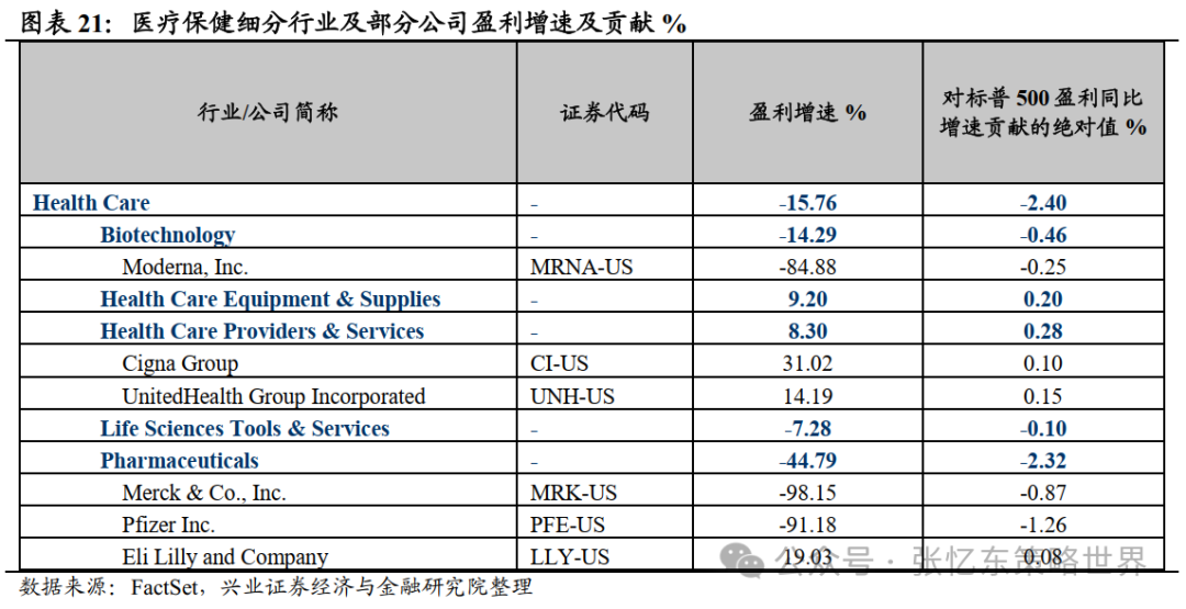 四、医疗保健:盈利同比增速降幅收敛,减肥药拉动业绩。细分行业中药品是主要拖累,权重股辉瑞四季度由于新冠产品销售下滑超预期,收入和利润不及预期;但是药品行业中礼来得益于减肥药对业绩的带动,成为医疗保健行业盈利同比增速中除医疗保险公司外贡献最大的公司。