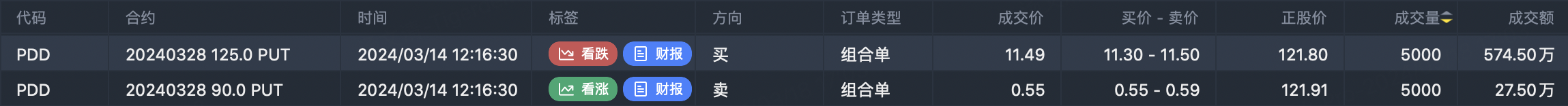 最需要提醒的是 $拼多多(PDD)$ 的看跌价差组合,5000手 $PDD 20240328 125.0 PUT$ 总共574万买入看跌,同时卖出5000手 $PDD 20240328 90.0 PUT$ 。这个意思就是看跌拼多多跌倒125以下,90以上。