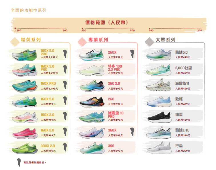 有测评博主对钛媒体APP介绍,特步目前的跑鞋分几个系列,比如精英系列、大众系列和专业系列,不同系列中又分为不同功能,例如有为跑马拉松比赛设计的竞速跑鞋160X3.0PRO、160X3.0;有针对日常竞速训练的260X;有缓震性能较为突出的减震旋,还有适合日常休闲慢跑的氢风6.0、聚能弹3.0等等。“从产品布局来看是比较全的”。