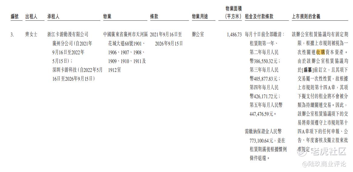 收购同年,卡游旗下的浙江卡游动漫有限公司又向原股东——实控人的妻子齐燕签订租赁合同,以承租人身份分别租1486平米、1516平米的办公室。其中一办公室的前五年月租金分别为38.6万元、38.6万元、40.6万元、42.6万元、44.7万元;另一办公室的月租金为10万元。
