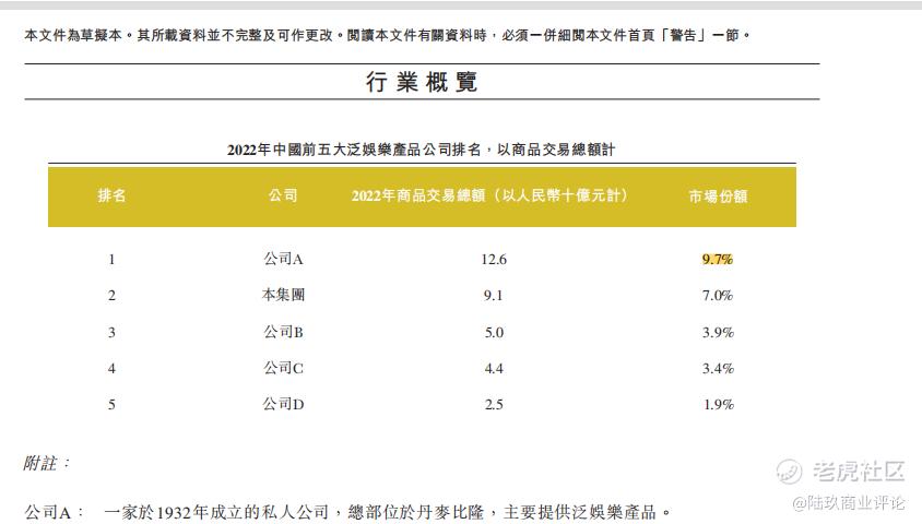 按2022年商品交易总额计,卡游公司的市场份额为7%,仅次于一家成立于1932年、市场份额为9.7%的丹麦私人公司(推测为乐高)。而且泛娱乐行业的市场集中度较低,在中国排名第五公司的市场份额也不过1.9%,排名第三公司(推测为泡泡玛特)的市场份额也不过3.9%。