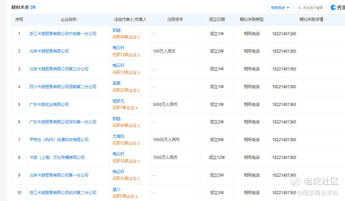 卡游关联贸易公司参保人数为0的原因成谜。作为注册地为山西的山西卡游贸易有限公司,不仅与卡游(上海)文化传播公司的电话一致,还与位于北京、广东等25家公司的联系方式一致。