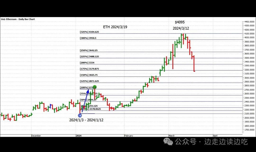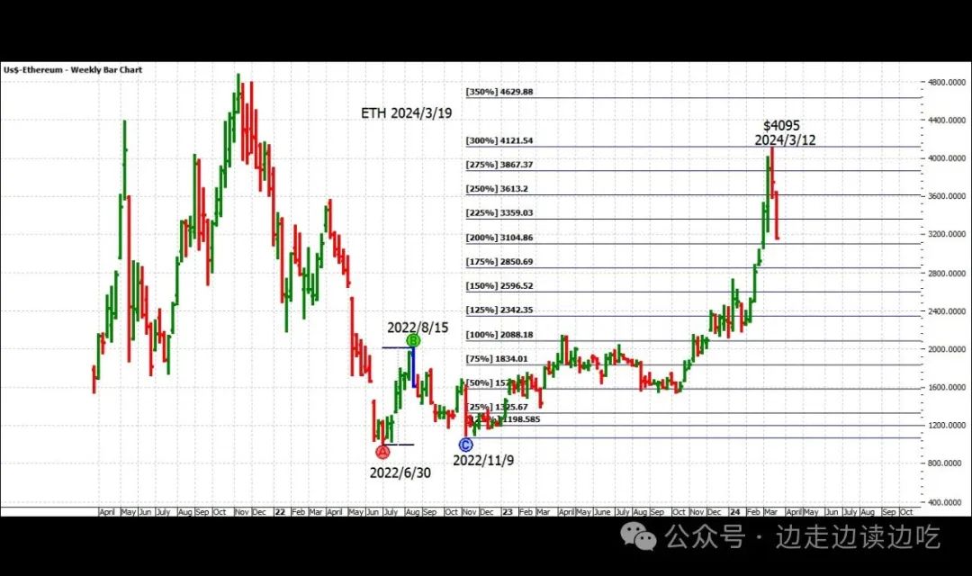 →第二浪从2022/11/9开始,至2024/3/12,最高至$4095。接近300%阻力位。
