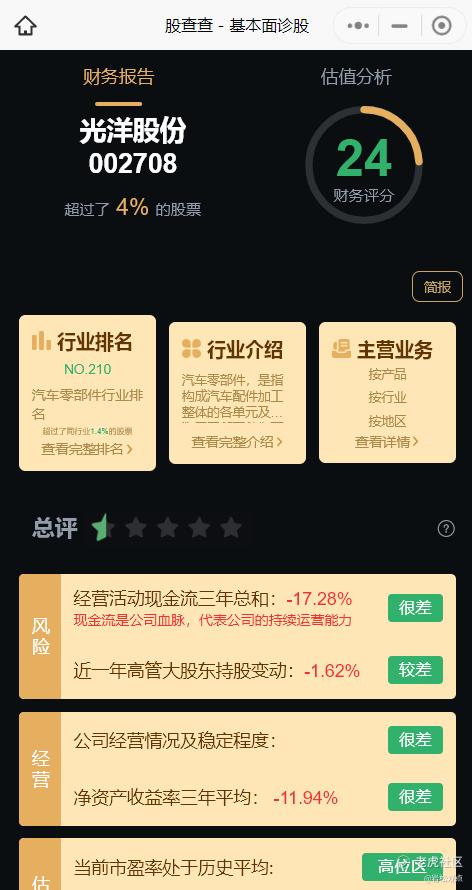 股查查总评半颗星,财务评分仅24分。