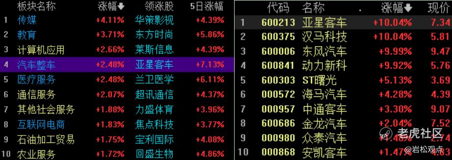 今天汽车板块大涨2.48%,继续创出反弹新高,亚星客车、汉马科技、东风汽车、动力新科涨停。