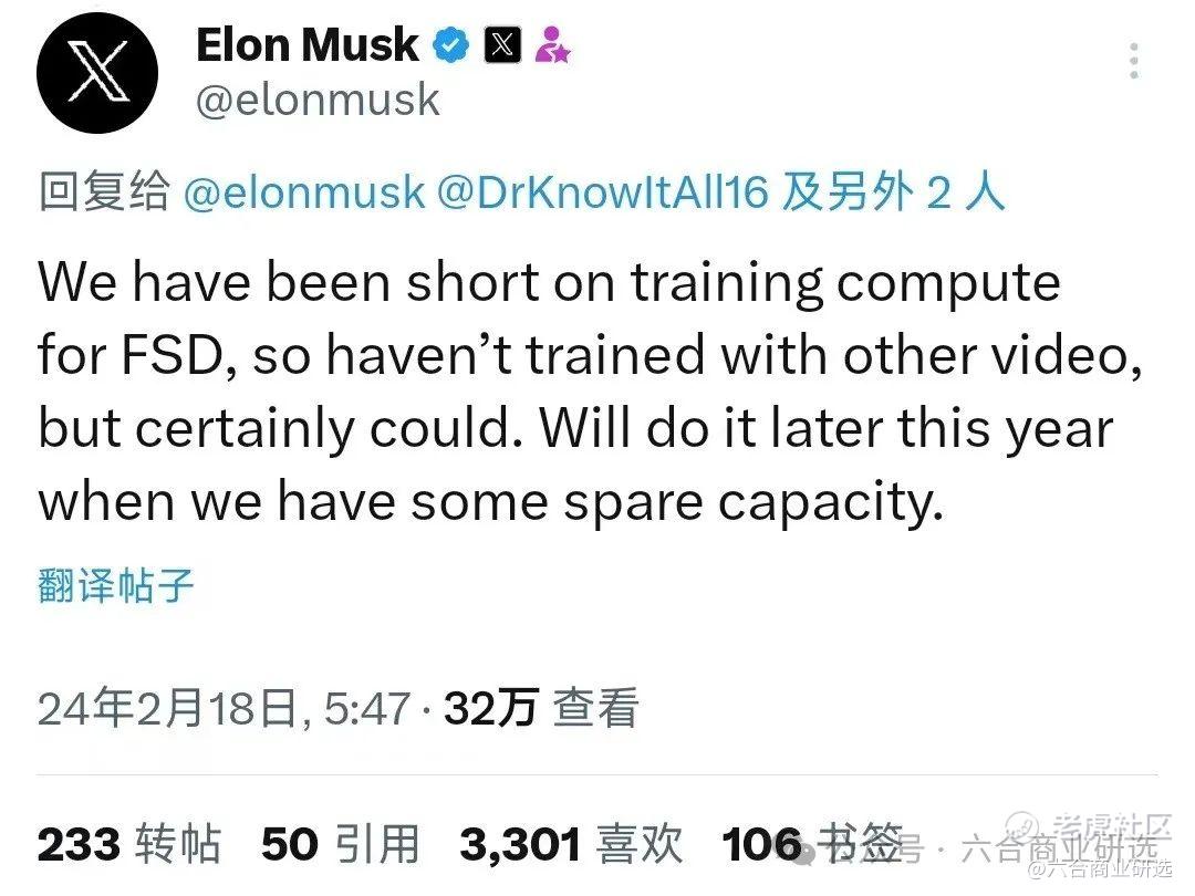 马斯克当时进一步表示,特斯拉具备视频生成能力,由于FSD算力不够,并没有用模型生成的视频进行训练;可以肯定,2024年晚些时候,特斯拉具有算力冗余时,将会用于视频生成能力训练。