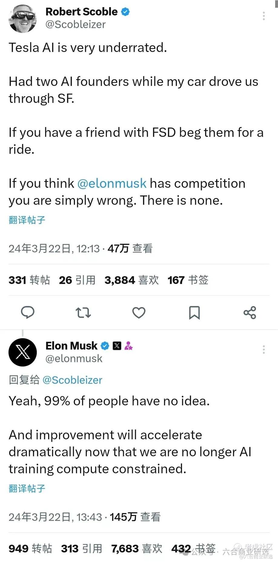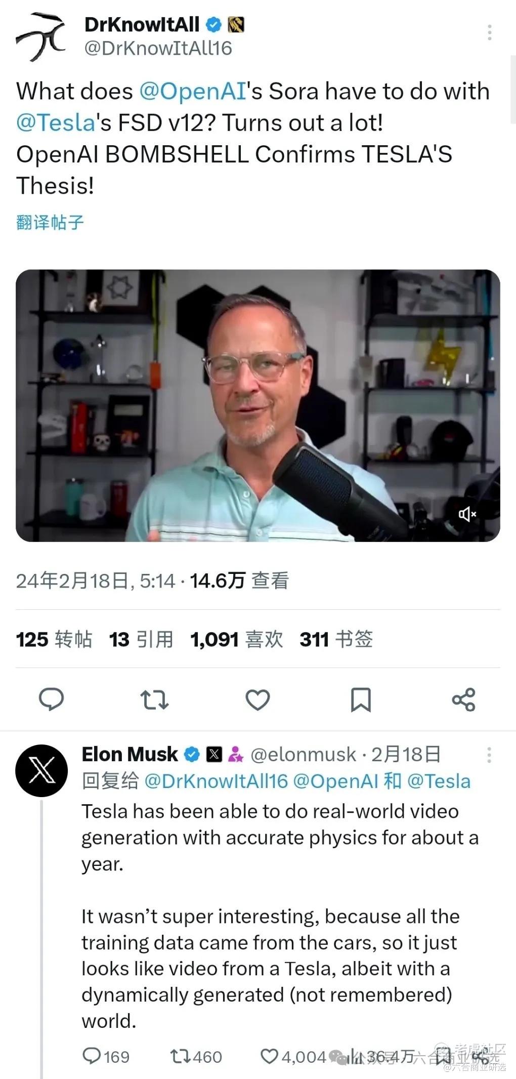 2024年2月,在Sora横空出世后,马斯克在X上回复: 1年前,2023年特斯拉就具备生成真实世界视频的能力,并且精准符合物理学。但不是很有趣,所有训练数据都来自汽车,视频看起来像来自特斯拉车辆上摄像头,尽管这是动态生成,而不是记录下的世界。
