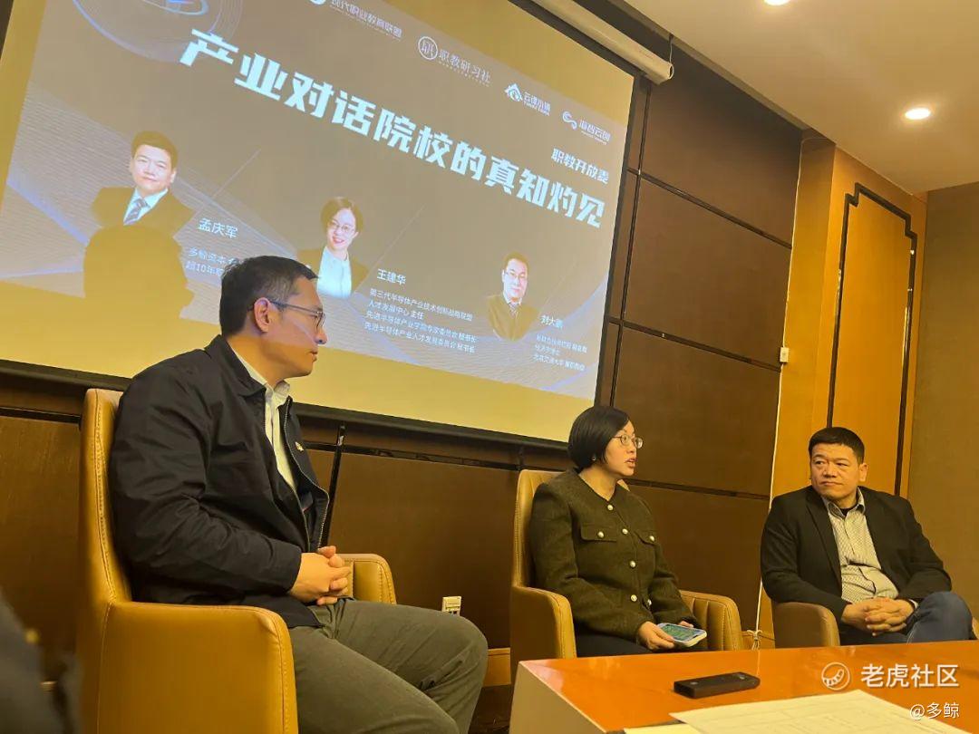主题演讲结束后,在职教开放麦环节,多鲸资本合伙人孟庆军、新联合投资控股有限公司副总裁经济学博士刘大鹏和第三代半导体技术创新战略联盟人才发展中心主任王建华一起分享了他们关于产业对话院校的真知灼见。