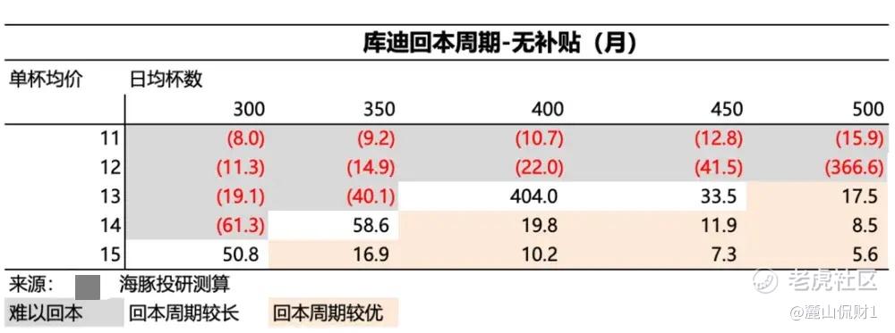 然而,根据海豚投研测算,以库迪11元左右的均价水平,500杯才有回本预期,但需要四年,而如今旺季跌破130的日均杯量,无疑击碎了不少库迪联营商的“回本梦”。