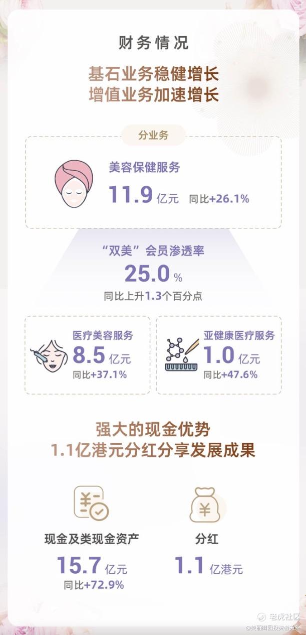 优异的业绩得益于公司独特的“双美”商业模式,其中“双美模式”的基石业务美容和保健服务稳健增长,实现收入人民币11.9亿元,同比增长26.1%;增值服务加速增长,医疗美容服务收入人民币达8.5亿,同比增长37.1%,亚健康医疗服务收入人民币1.0亿元,同比增长47.6%。各项亮眼的数据,不仅再一次证明了双美模式的先进性和韧性,同时也为公司外延并购及后续现金流带来了强有力的支撑。