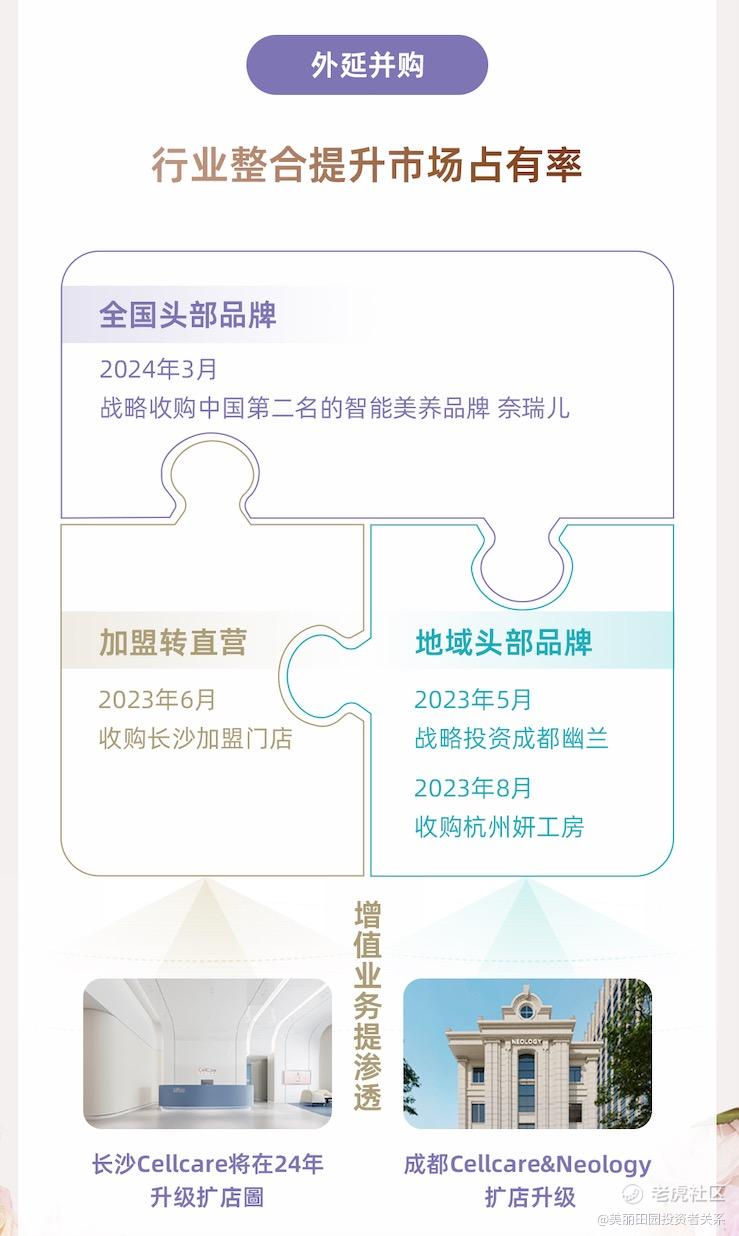 除此之外,美丽田园一方面积极探索投资和收购地域龙头品牌提升现有直营城市的市占率。例如,2023年5月战略投资成都幽兰品牌,2024年2月,成都秀可儿医美门诊扩容迁址开业,3月成都研源门诊正式营业,推动成都地区三美业务的收入规模提升;2023年8月完成杭州妍工房门店的收购,杭州地区品牌影响力和收入获提升。