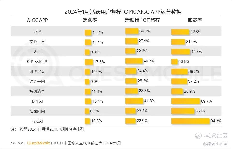 而且这些头部AI应用的用户活跃率,都只有10%左右,3日留存则平均在30%...