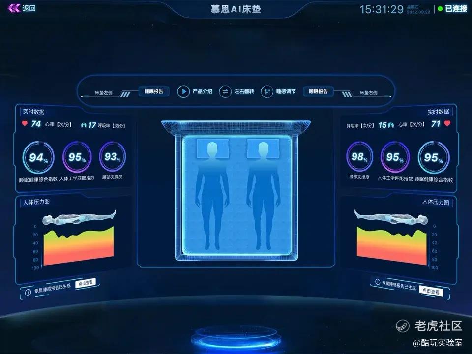 就拿慕思AI床垫T11 PRO举例,你躺在上面一晚,它便能收集到你的心跳、呼吸频率、睡姿,以及你身体在床垫各个部位的压力变化。