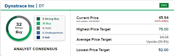 摩根士丹利在2月中旬给予了该股等权重评级,称长期"股价应会继续上涨,因技术强劲,产品广泛,且整合机会将使Dynatrace成为净受益者。"给予此公司60美元的目标价表明,Dynatrace相较于周二收盘价将可能上涨30.4%。BMO Capital分析师Keith Bachman去年曾表示,Dynatrace将成为人工智能领域的领导者。