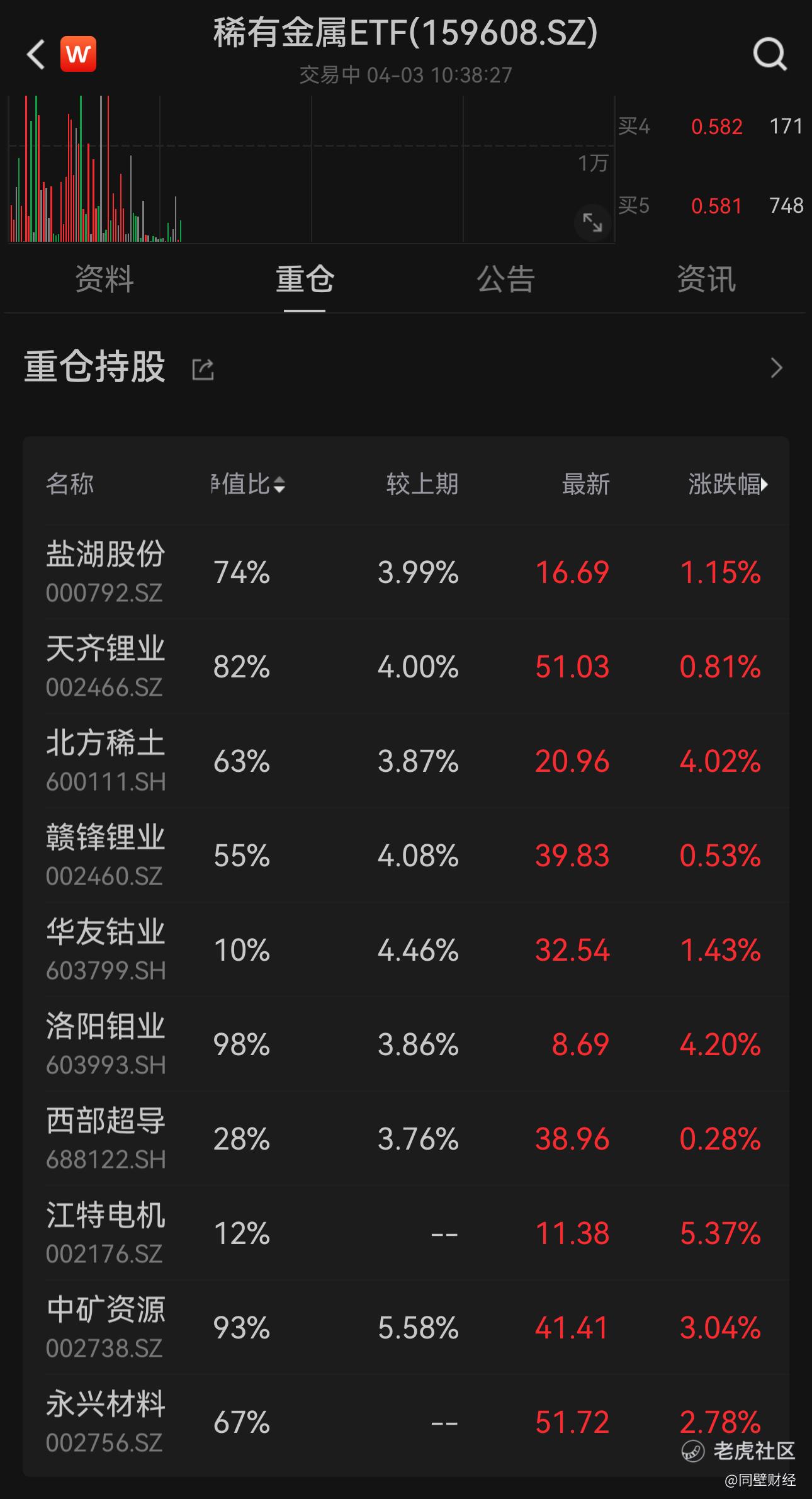 该基金前十大权重股集体上涨,江特电机涨超5%,洛阳钼业、北方稀土涨超4%,中矿资源、永兴材料等个股跟涨。