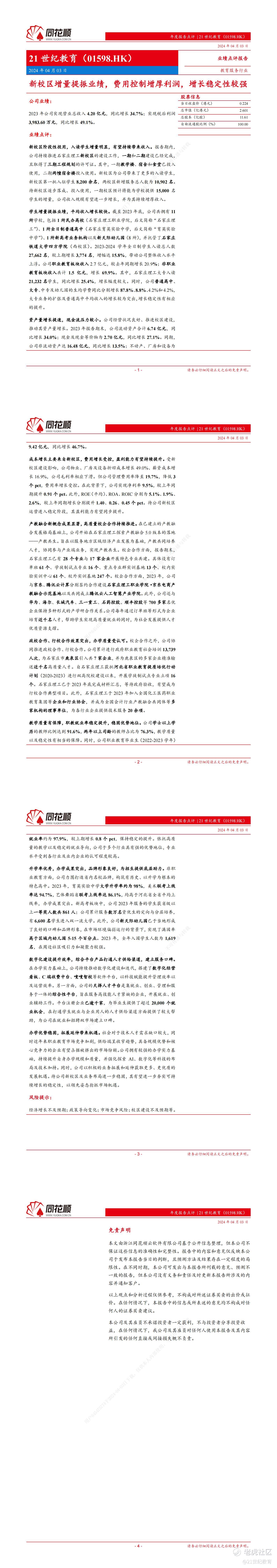 4月3日,同花顺金融研究中心发布研究报告称21世纪教育(1598.HK)新校区增量提振业绩,费用控制增厚利润,并指出未来增长性较强。