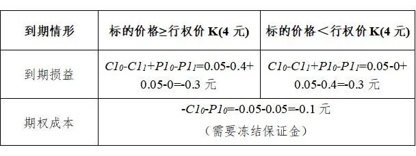 情况一:若到期时,标的价格高于行权价K1=4元时,假设到期标的价格S1=4.4元,卖出的认购期权具有行权价值,此时卖出的认购期权价值C11=S1-K1=4.4-4=0.4元,卖出的认购期权损益为C10-C11=0.05-0.4=-0.35元;卖出的认沽期权将没有行权价值,此时卖出的认沽期权价值P11=0元,卖出的认沽期权损益为P10-P11=0.05-0=0.05元。