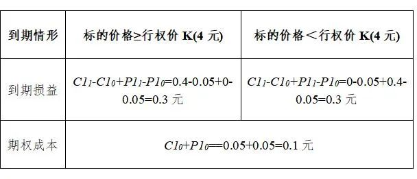 情况一:若到期时,标的价格高于行权价K1=4元时,假设到期标的价格S1=4.4元,买入的认购期权具有行权价值,此时买入的认购期权价值C11=S1-K1=4.4-4=0.4元,买入的认购期权损益为C11-C10=0.4-0.05=0.35元;买入的认沽期权将没有行权价值,此时买入的认沽期权价值P11=0元,买入的认沽期权损益为P11-P10=0-0.05=-0.05元。
