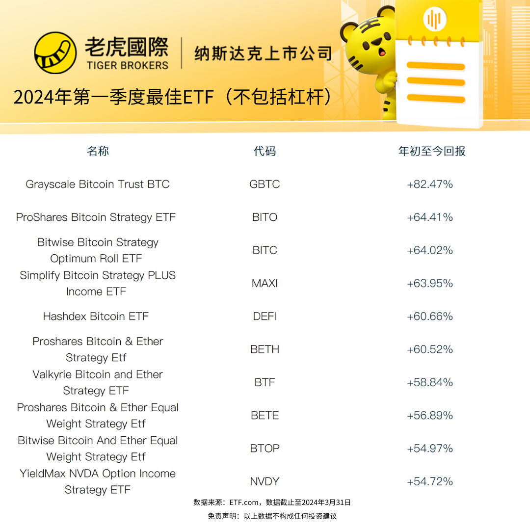 2024年首季最佳ETF揭秘:NVDX涨幅超200%,GBTC异军突起