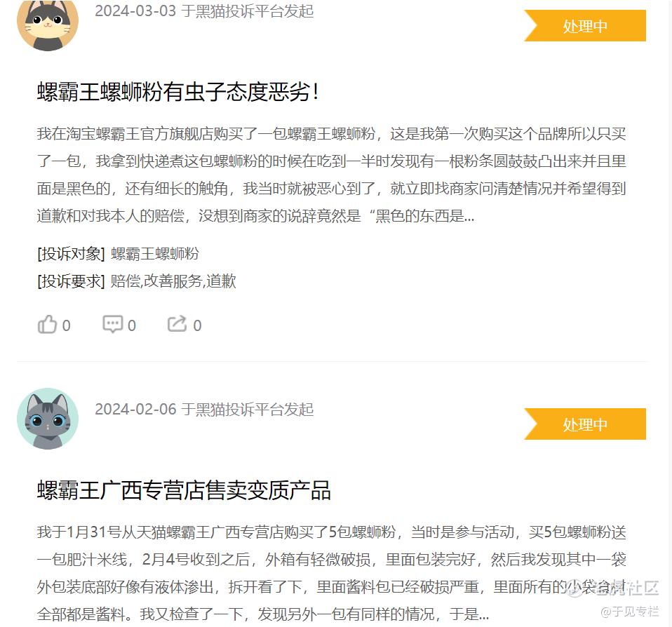 例如,最近的2023年3月,黑猫投诉上就有消费者反馈称,自己在螺霸王淘宝官方旗舰店购买的螺蛳粉,吃到一半发现有虫子,而反馈给商家时,商家却推脱并非虫子,是水稻磨成了黑色,看起来像虫子。该消费者认为商家客服态度恶劣,希望赔礼道歉,给予赔偿。